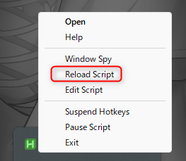 タスクトレイに常駐化したAutoHotkeyのアイコンがあるので、右クリック→[Reload Script]をクリック。